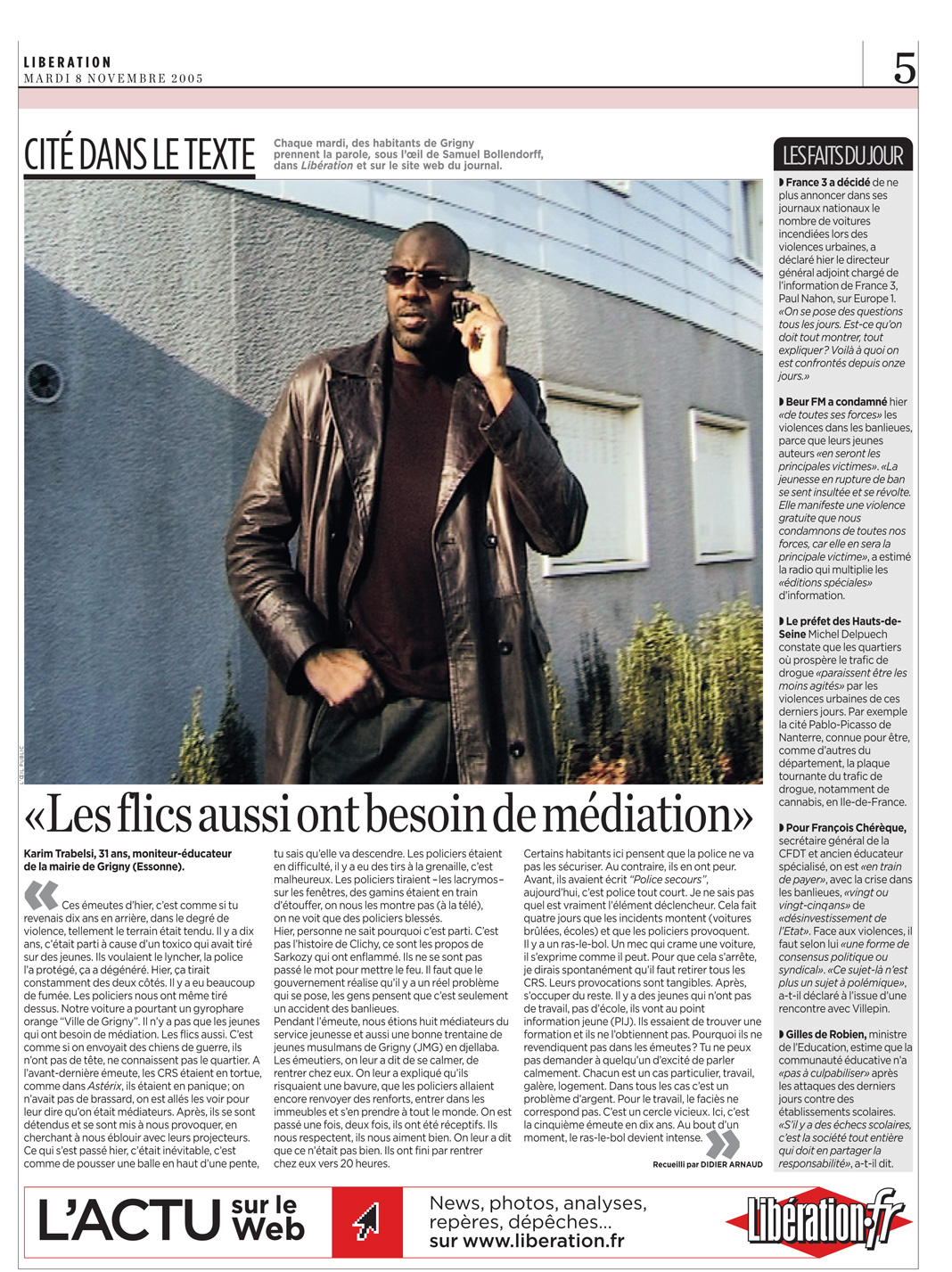 1. [...] journaliste à Libération et Samuel Bollendorff photographe à l’Oeil Public ont proposé une chronique hebdomadaire dans le journal et sur le site de Libération. Ainsi, durant une année, de janvier à décembre 2005, des habitants de Grigny, une banlieue du [...]